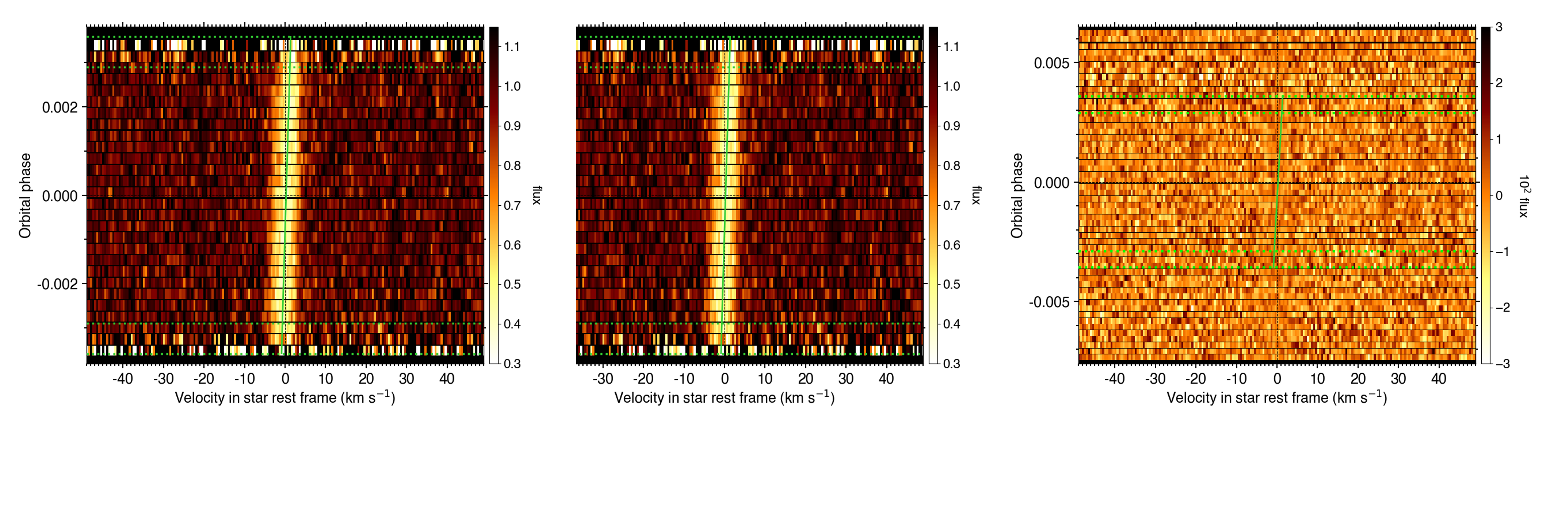 Fig. 29 From left to right: flux map of intrinsic CCFs occulted by TOI-421c as a function of RV in the star rest frame (in abscissa) and orbital phase (in ordinate), corresponding best-fit model, and residuals between the disk-integrated master-out and individual CCFs (outside of transit) and between intrinsic CCFs and the best-fit model (during transit). The green solid line shows the best-fit surface RV model. Transit contacts are shown as green dashed lines.#