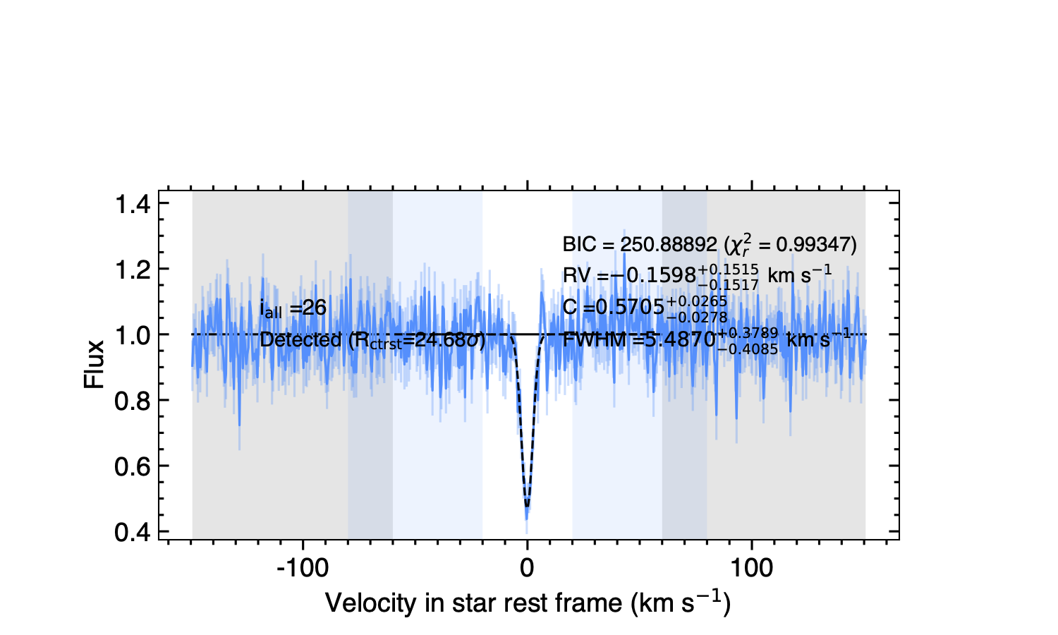 Fig. 24 Example of intrinsic CCF occulted by TOI-421c. Blue shaded areas indicate the continuum ranges. Grey shaded areas are excluded from the fit.#