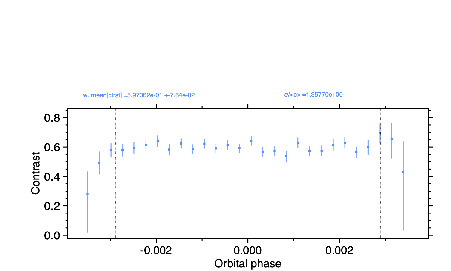 Here, intrinsic CCFs are measured with high-enough S/R that the PDFs for the fitted properties are all well-defined and do not need to be further constrained. Otherwise, the second step would consist in setting up narrower priors based on the derived property series; their PDFs, MCMC chains and corner plots; and their fit (see next section). For example, if the fit converged poorly for one intrinsic CCF during the TOI-421c transit, due to a lower S/R, we could reasonably bound the model line contrast within 0.4 - 0.8 based on the time-series in Fig. 26. Or, the stellar projected rotational velocity of 1.6 km/s that you will derive from the fits to the surface RVs (section) and the fit to the intrinsic CCF series (section) could be set as an upper limit on the model line centroid.