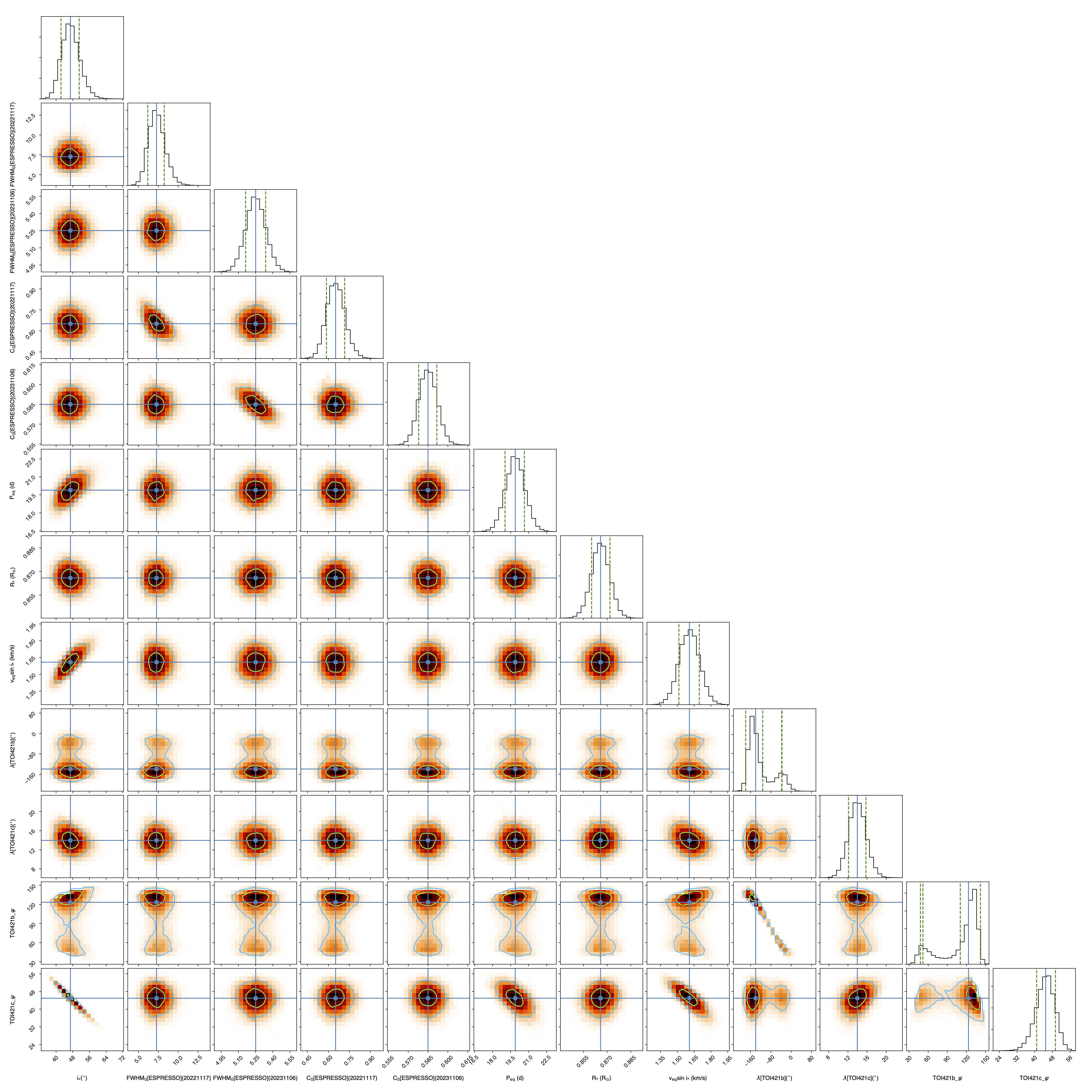 Outputs from the RM Revolution fit can be found in the /Working_dir/Star/Planet_Saved_data/Joined_fits/IntrProf/mcmc/ directory. It is advised to check the MCMC chains and correlation diagrams after a preliminary run, and adjust the MCMC settings accordingly for the final run. Fig. 28 shows the best-fit correlation diagram for a subset of the model parameters in the final joint fit to the TOI-421b and c visits.