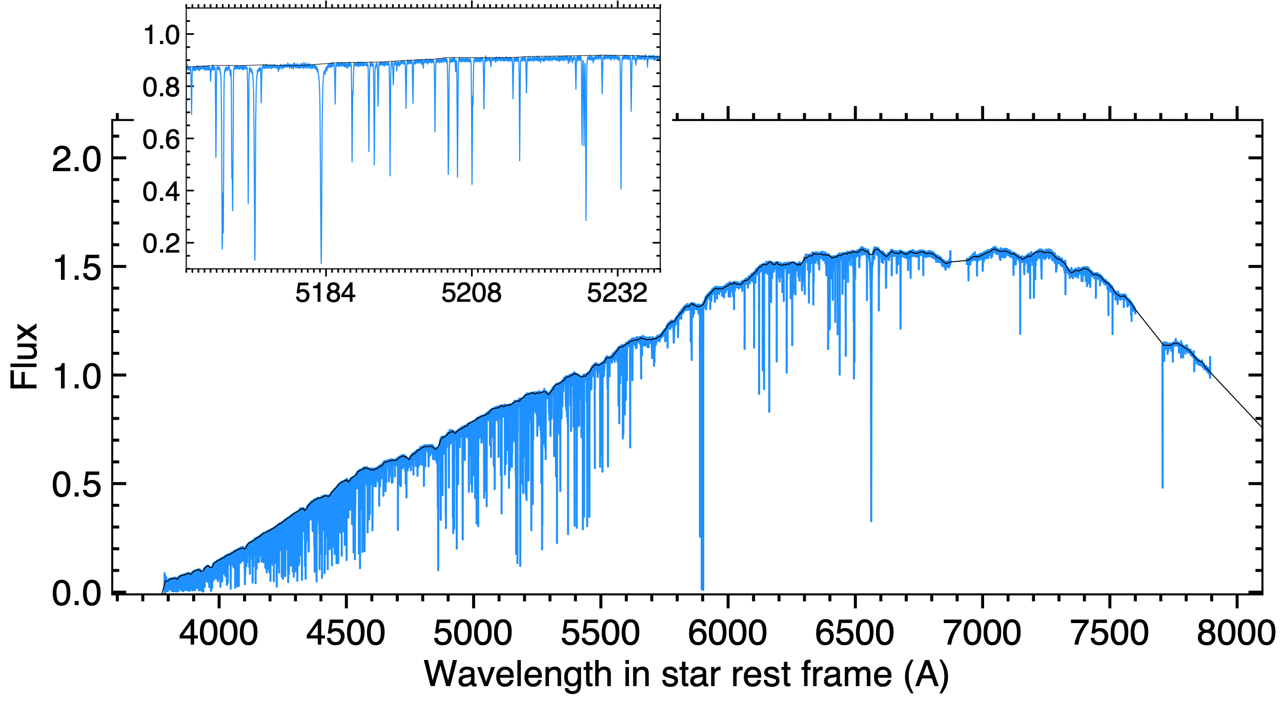 Fig. 19 Continuum (black profile) determined over a 1D disk-integrated master stellar spectrum (blue).#
